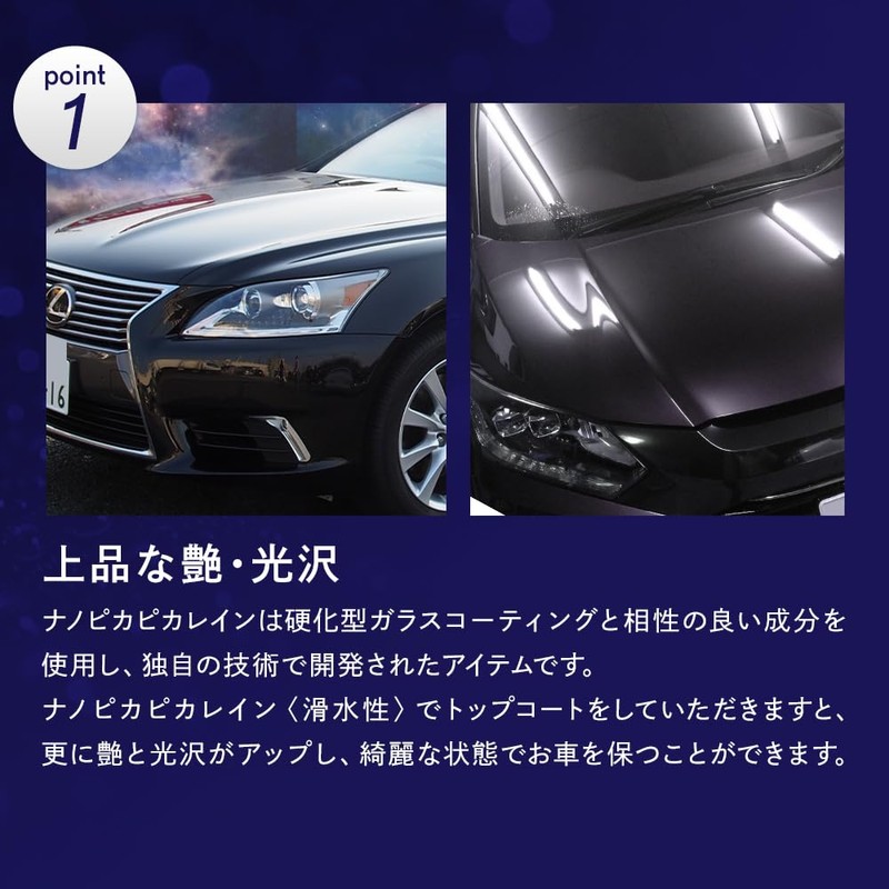 - Simply applying the product to the whole of the vehicle body will result in a hard coating that will provide and maintain a stronger shine and water-sheeting effects, for a long period.