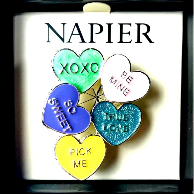 Napier Valentines Day Conversation Hearts Brooch Pin SilverTone Enamel NEW w Box