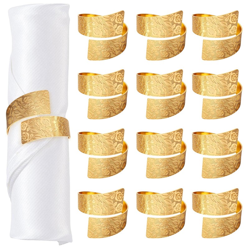 Napkin Rings Set of 12, Irregular-Shaped Metal Napkin Holders with Rose Patterns for Wedding Dining, Holiday Table Decor, Perfect for Home Chefs & Party Planners(Gold)