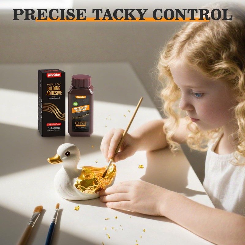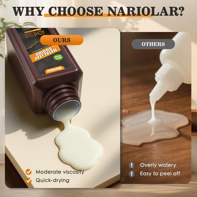 - 【Perfect Viscosity for Gold Leaf】 Nariolar's water-soluble Metal Leaf Adhesive is designed with the ideal viscosity for seamless gold leaf application. Simply mix in a 10:1 to 10:2 ratio, apply, and wait 15-30 minutes. Once it reaches a sticky note-like texture, you're ready for smooth, precise adhesion.