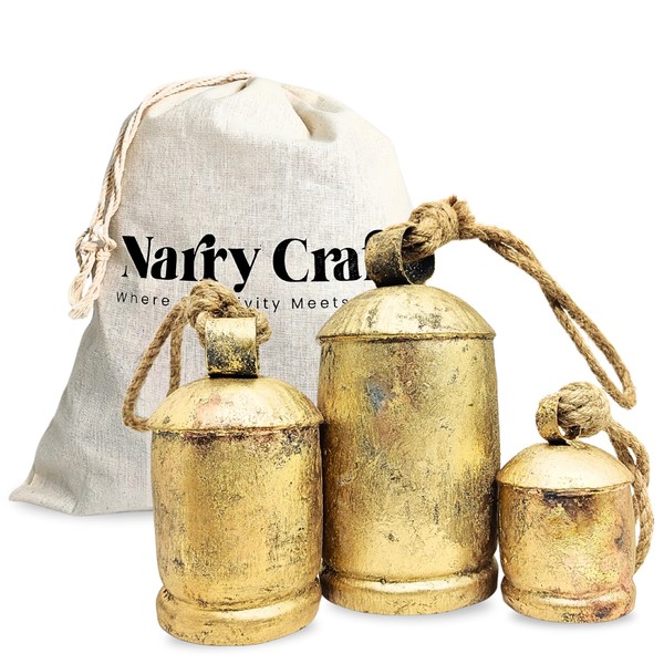 NARRY CRAFT Giant Harmony Country Cow Bells Huge Hanging on Rope Antique Gold Christmas Hanging XL Lucky Bells On Rope (Country Rustic, Large)