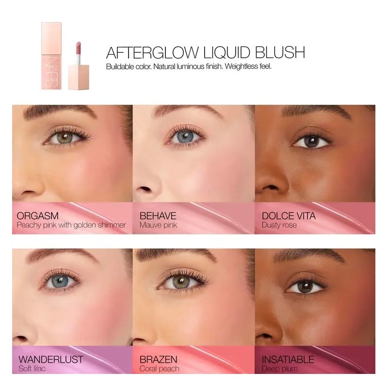 NARS Afterglow Liquid Blush is a lightweight, buildable liquid blush with lasting radiance and all-day hydration.