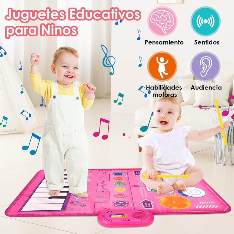 - 🎹【Pad Musical Multifuncional 2 En 1】Disfruta de dos experiencias musicales con este Alfombrilla de Musicales de Piano que combina las funciones de un tambor y un piano. La superficie del piano incluye 6 sonidos de instrumentos (piano, violín, saxofón, acordeón) y 13 teclas,13 Modos de Canciones 8 Canciones rítmicas y la superficie del tambor tiene 2 baquetas para que dos niños toquen el tambor al mismo tiempo. Lo que la convierte en un gran juguete de aprendizaje temprano.