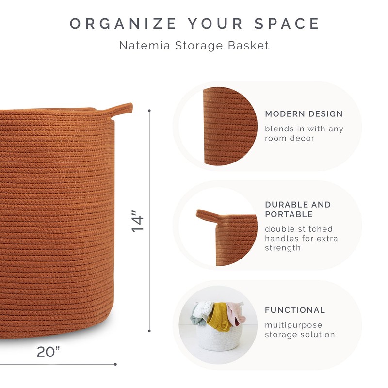 - ORGANIZE YOUR SPACE! Natemia’s rope storage basket is the perfect organizer for all baby things, including toys, clothes, towels, swaddles, laundry and more! At 15”x15”x 14” our storage bin is extra roomy and will help you organize your daily routine!
