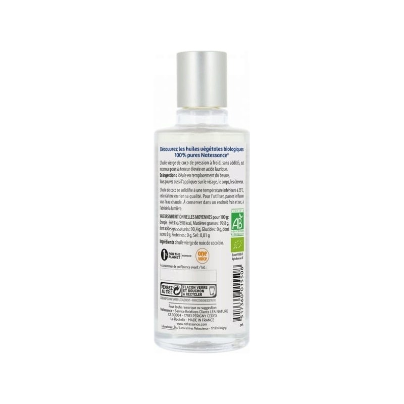 The Organic Coconut Oil by Natessence is a cold-pressed oil of exceptional quality. It is derived from the pulp of the fruit and is valued for its high lauric acid content and nourishing as well as hydrating effects.