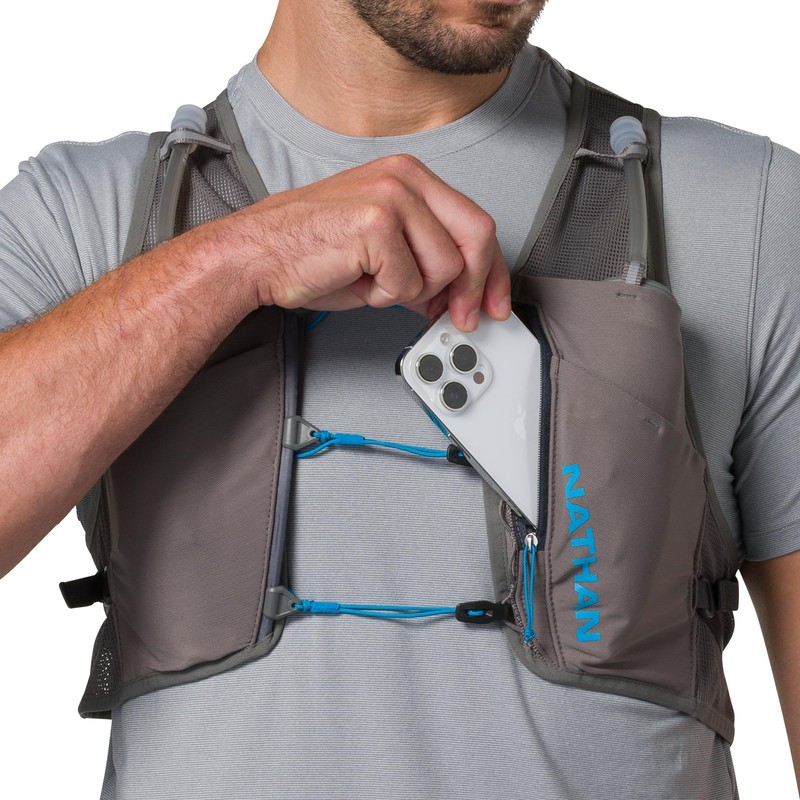 - A compression hydration vest to fit like a second skin. Front zipper pocket for smart phone and essentials. Large back pocket designed with separate storage for bladder and additional items.