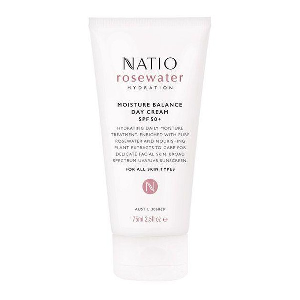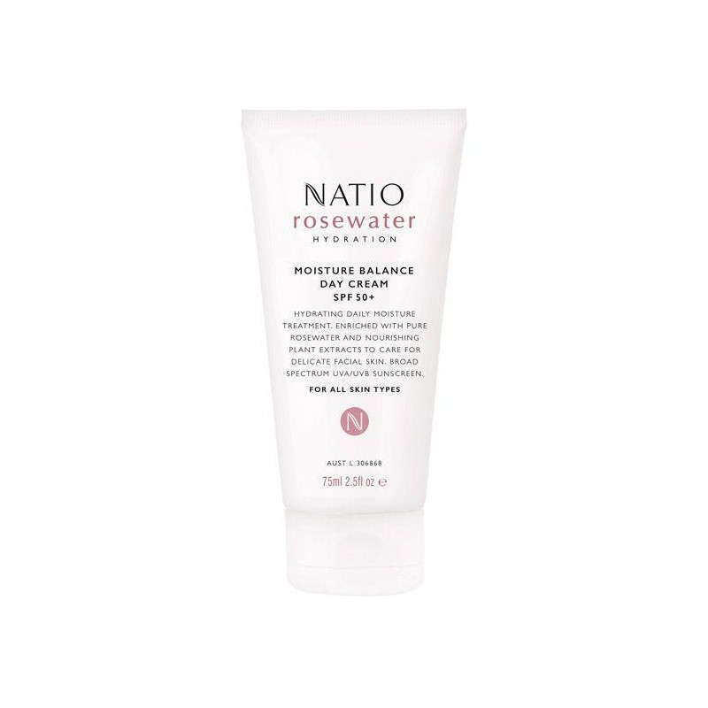 Natio Rosewater Hydration Moisture Balance Day Cream SPF 50+ 90ml is a daily moisture treatment with SPF 50+ broad spectrum UVA/UVB sunscreen that combines very high sun protection with balanced skin hydration.