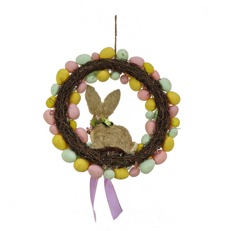 - This artificial hanging wreath is decorated with a variety of sized pastel eggs painted yellow, pink and teal and an adorable bunny that rests in the middle of the decoration