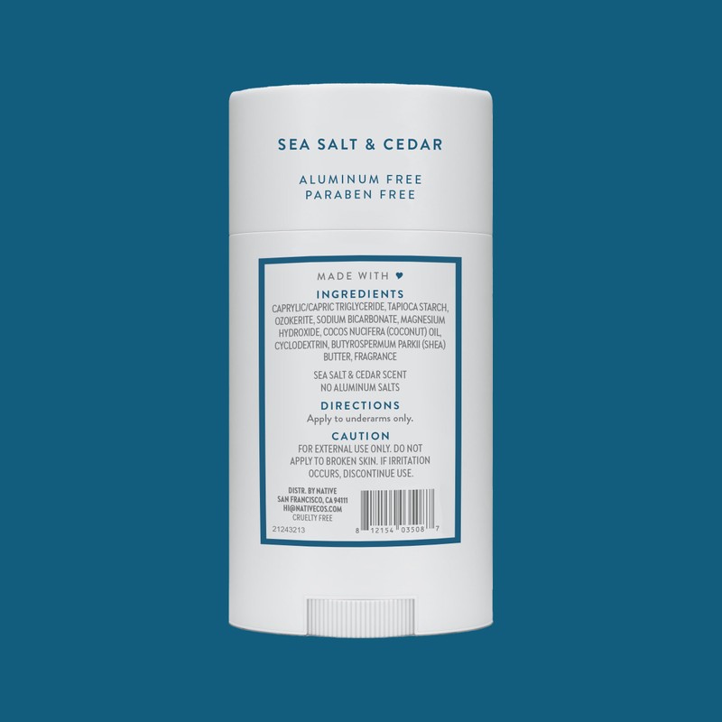 - Native Sea Salt & Cedar - Warm, cozy, inviting cedar along side hints of humid sea air and cool salt water help create this vegan deodorant.