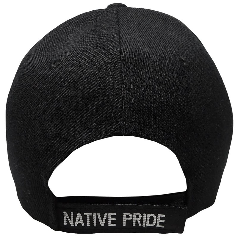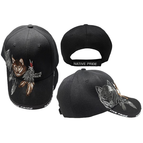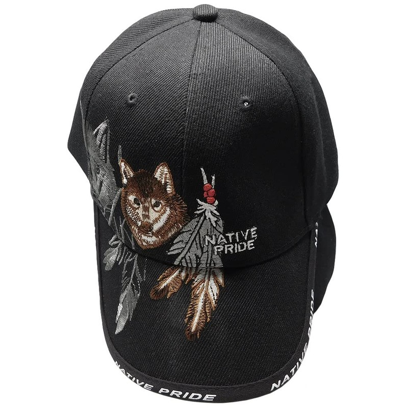Native Pride Indian Wolf Shadow Feather Black 100% Cotton Adjustable Embroidered Hat Cap