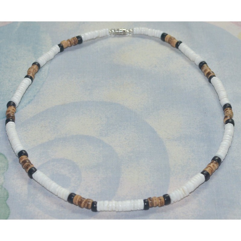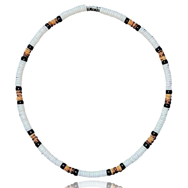 Native Treasure 15" Mens and Womens Summer Beach Surfer Necklace From the Philippines, White Ark Shells with Black and Mixed Brown Coconut Beads