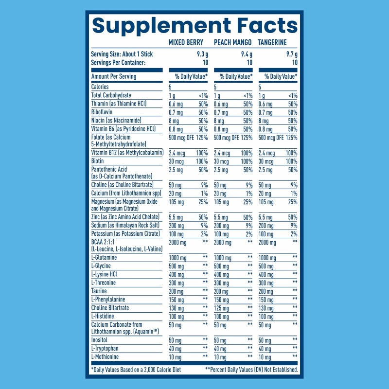 Thiamine (as Thiamine HCI), Riboflavin, Niacin (as Niacinamide), Vitamin B6 (as Pyridoxine HCI), Folate (as Calcium 5-Methyltetrahydrofolate), Vitamin B12 (as Methylcobalamin), Biotin, Pantothenic Acid (as D-Calcium Pantothenate), Choline (as Choline Bitartrate), Calcium (from Lithothamnion spp), Magnesium (as Magnesium Citrate), Zinc (as Zinc Amino Acid Chelate), Sodium (as Himalayan Rock Salt), Potassium (as Potassium Citrate), BCAA 2:1:1 (L-Leucine, L-Isoleucine, L-Valine), L-Glutamine, L-Glycine, L-Lysine HCI, L-Threonine, Taurine, L-Phenylaline, Choline Bitartrate, L-Histidine, Calcium Carbonate (from Lithothamnion spp. (Aquamin™)), Inositol, L-Tryptophan, L-Methionine.WARNINGS: