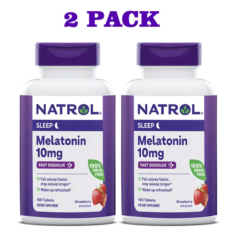 ¡Doble potencia de sueño! Natrol Melatonina 10 mg (2-Pack) incluye 200 tabletas sabor fresa de rápida absorción. Ayuda a dormir mejor y evitar el insomnio ocasional. Es 100% libre de fármacos, no forma hábito, vegetariano, y se toma sin agua. ¡Tu solución para un descanso profundo y revitalizante!