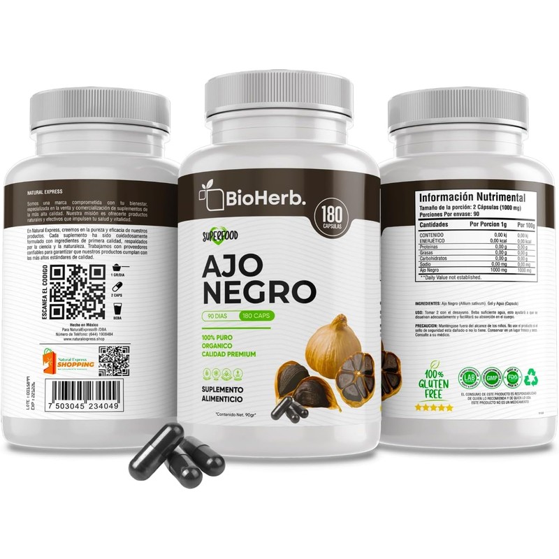 🧄 Fortalece tu salud con BioHerb Ajo Negro 100% Puro, un suplemento natural con 180 cápsulas de 500 mg que proporciona un suministro completo para 90 días.