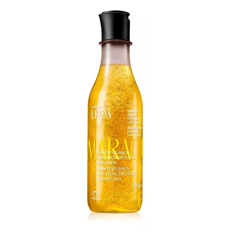 Con partículas exfoliantes hechas con semillas naturales del maracuyá exfolia suavemente la piel dejandola limpia perfumada y renovada