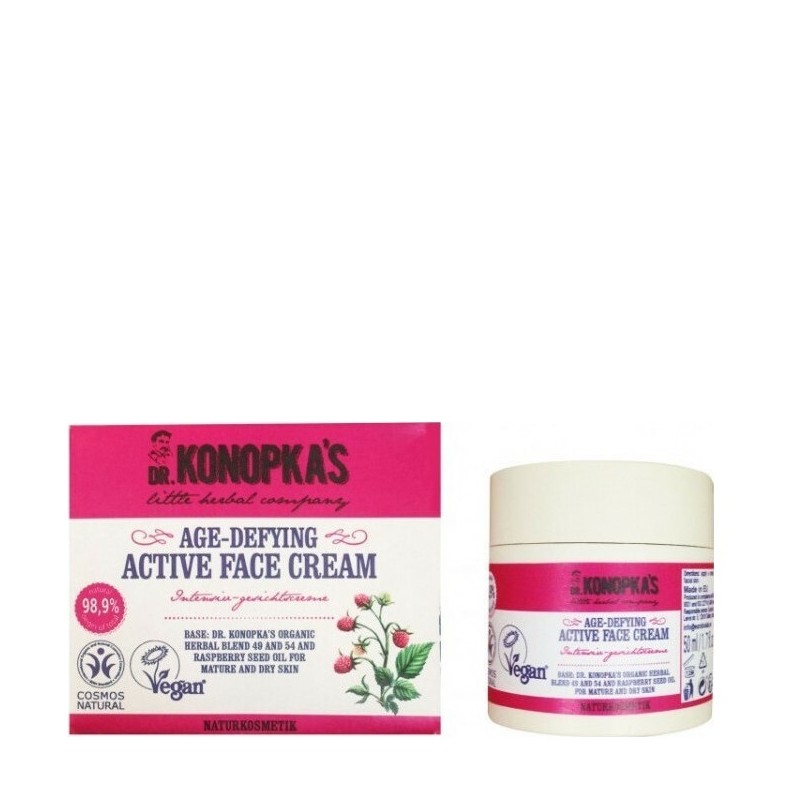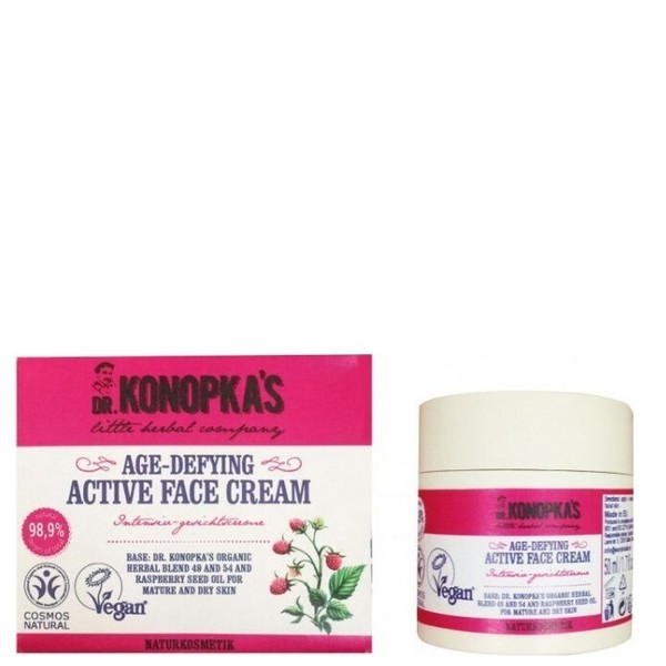 This active anti-aging face cream contains the special herbal essential oils Dr. Konopkas's No49 and No54. Its composition includes vitamins and minerals that offer additional nutrition and hydration to mature and dry skin, helping to prevent aging. Enriched with raspberry, it activates the regeneration and restructuring of the energy balance of the skin, giving it firmness and elasticity.