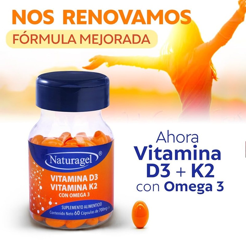 - Conclusión: Naturagel Vitamina D3 con K2 y Omega 3 700mg 30 Cápsulas es un suplemento integral que combina tres nutrientes esenciales. La combinación de vitamina D3 para la absorción de calcio, vitamina K2 para asegurar su correcta distribución, hace de este producto una excelente opción para quienes buscan mejorar su bienestar integral.