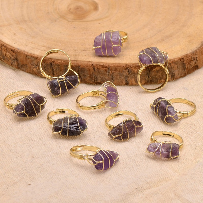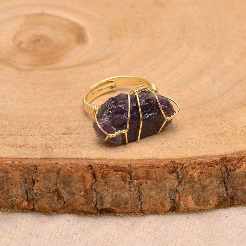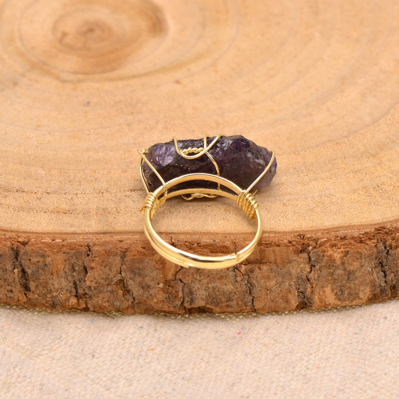 • Select qualified rough purple amethyst gemstone for the ring; Hand wrapped up with brass wire in yellow gold tone