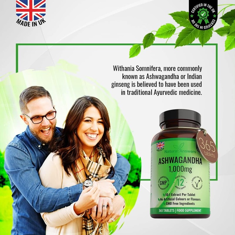 Natural Answers Ashwagandha 1000mg Tablets | 365 Vegan Tablets for 1 Year Supply | High-Strength Pure Ashwagandha Powder | Anxiety & Stress Support | UK-Made, Not Capsules or Pills