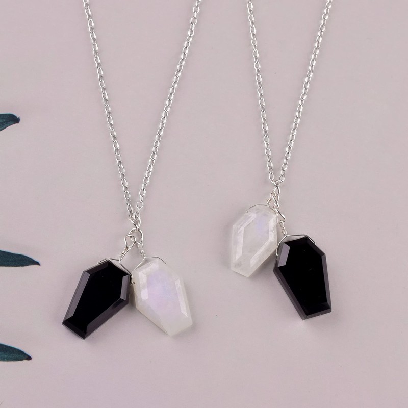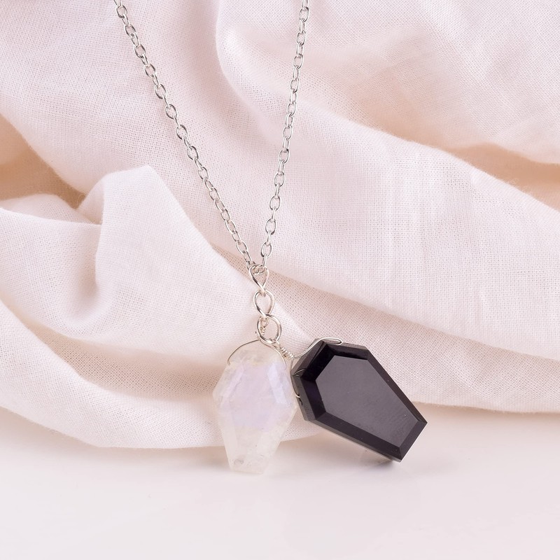 Natural Black Onyx and Rainbow Moonstone Necklace Pendant, Coffin Cabochon, Energy Healing Crystals, Birthday, Gift for Women, Gemstone Jewelry 18 inch AAA+ Quality (moonstone and onyx)