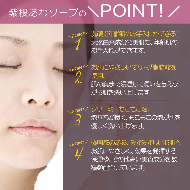 - (Purple Root Extract) Luxurious foaming soap made from olive fatty acids and beauty ingredients