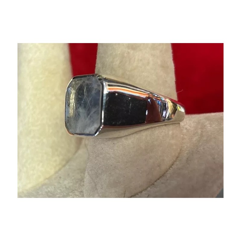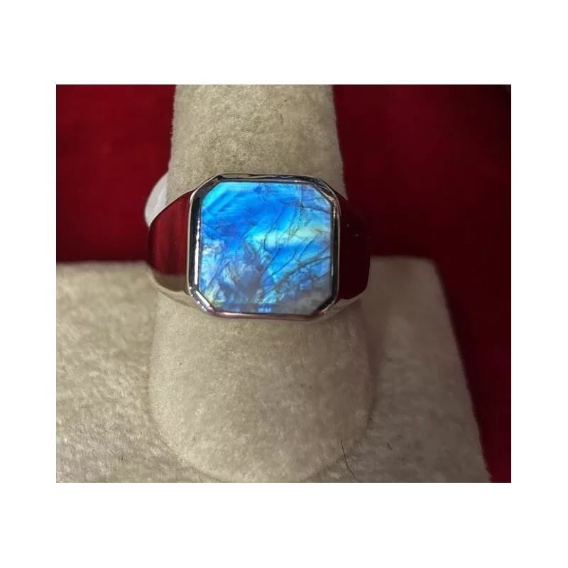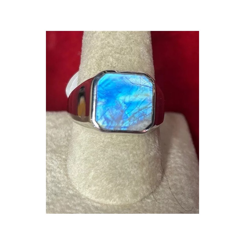 Add a touch of elegance to your jewelry collection with this stunning men's sterling silver ring. The ring features a beautiful rainbow moonstone that will catch the eye of anyone who sees it. The blue color of the stone complements the silver band, making it a versatile piece that can be worn with any outfit.