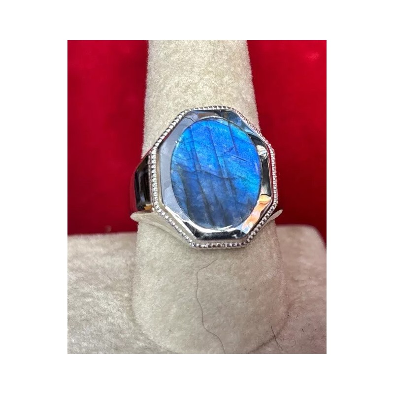 The ring is designed for men and has a sleek and stylish look. The blue Labradorite stone adds a pop of color to the ring and the fire main stone color makes it stand out. This ring is perfect for anyone who wants to add a touch of elegance to their wardrobe.