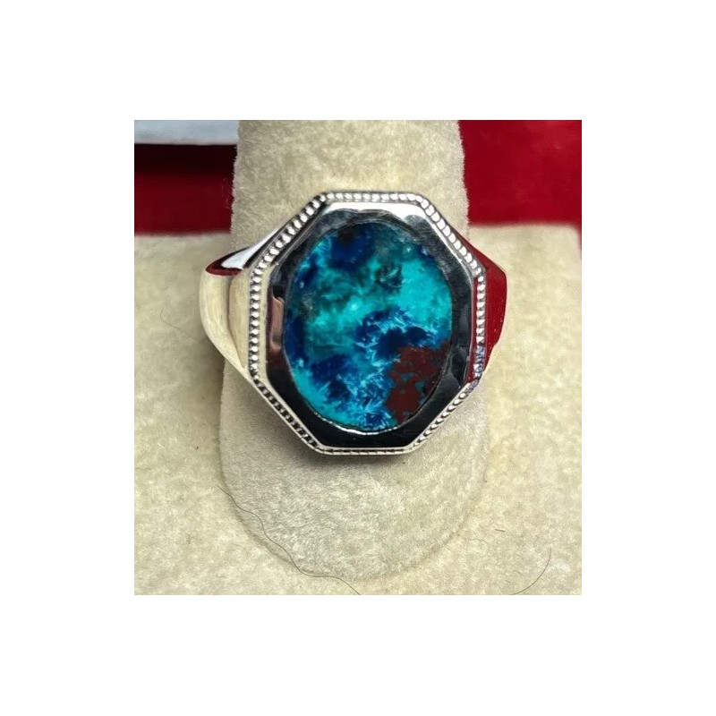This exquisite men's ring is made of high-quality sterling silver and features a stunning blue shattuckite stone. Crafted by Natural Creations, this ring is a perfect addition to any jewelry collection. The ring is available in size 8 and is designed to fit comfortably on any finger. The blue color of the stone adds a touch of elegance to the ring, making it perfect for any occasion. The ring is perfect for men who appreciate the beauty of natural stones and want to add a unique piece to their collection.