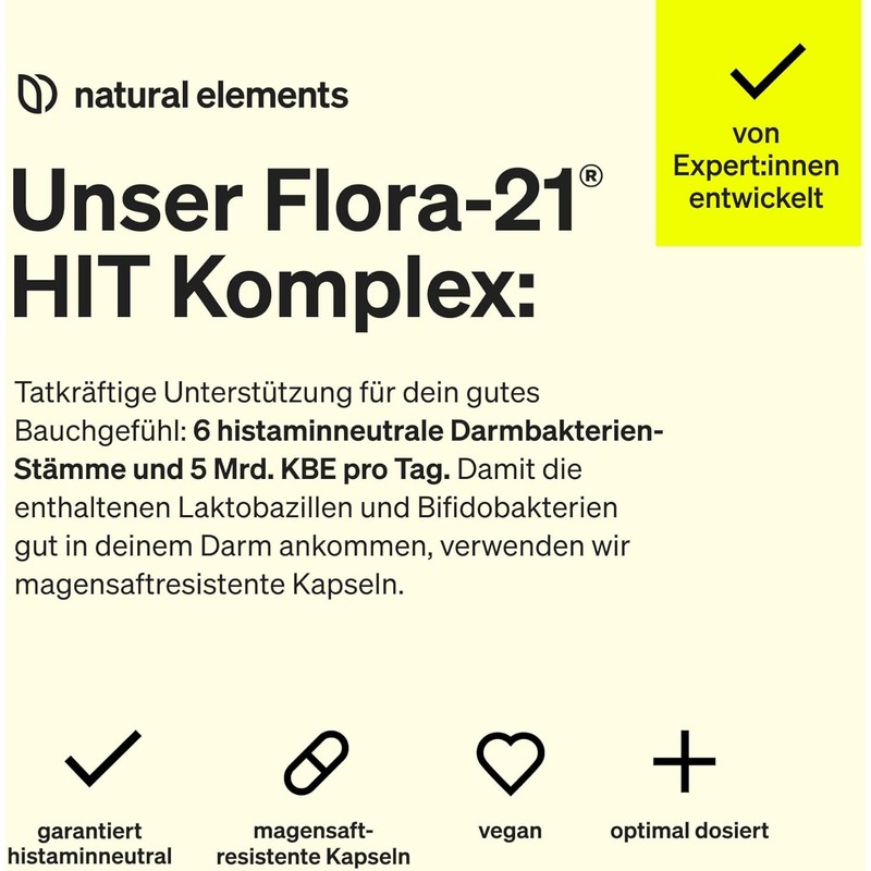 natural elements Flora 21 HIT Kulturen Complex - 6 Bacterial Strains Lactobacilli and Bifidobacteria - 60 Enteric Juice-Resistant Capsules - Laboratory Tested, Vegan, High Dose and Produced in Germany