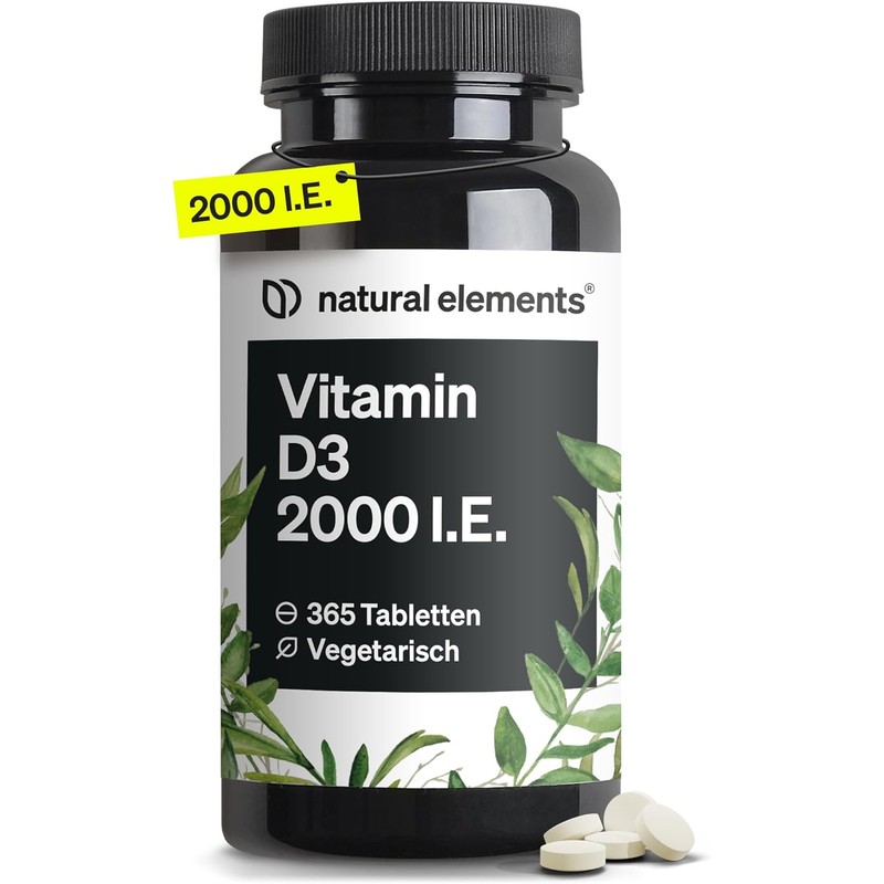 natural elements Vitamin D3 2000 I.E. – 365 Tabletten – für Knochen und Immunsystem – hochdosiert, ohne unnötige Zusätze – in Deutschland produziert & laborgeprüft
