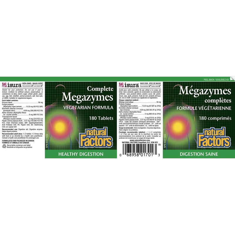- VEGAN/VEGETARIAN FORMULATION: Natural Factors Complete Megazymes is non-GMO, suitable for vegetarians and vegans, and contains no dairy,wheat, starch, sugar, gluten, yeast, soy, egg, fish, shellfish, salt, or tree nuts. The small tablets are easier to swallow and contain no artificial colours, preservatives, or sweeteners.