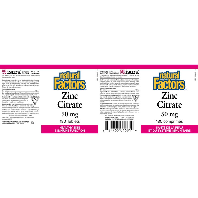 Natural Factors Zinc Citrate 50 mg, 180 Tablets, Healthy Skin & Immune Function, One-Per-Day Formula