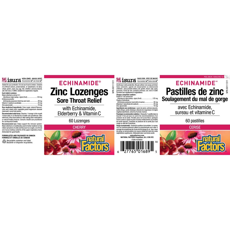 Natural Factors Zinc Lozenges combine the essential nutrients zinc and vitamin C, along with a full-spectrum organic echinacea extract and black elderberry extract, to help maintain immune function and soothe irritated upper airway membranes. The delicious, naturally flavoured honey blossom and cherry lozenges dissolve in the mouth for convenient relief of cold and flu symptoms, such as cough, sore throat, and mucous congestion.