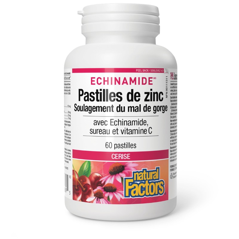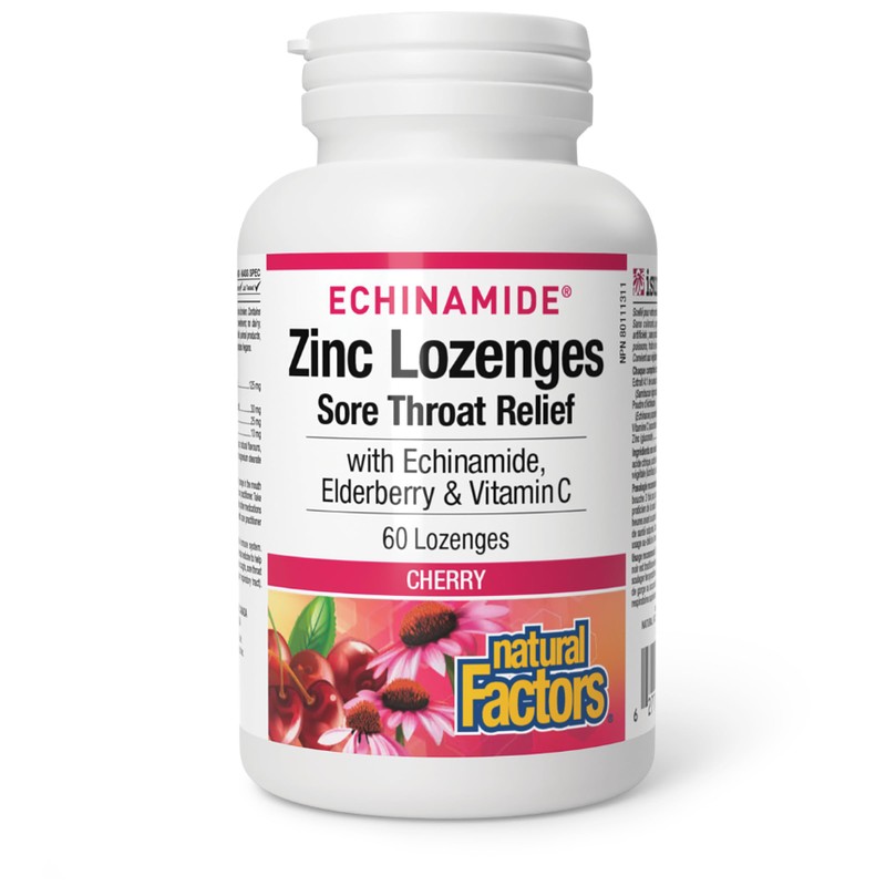 Natural Factors Zinc Lozenges, 60 lozenges, Cherry Flavour, with Echinamide, Elderberry & Vitamin C, Sore Throat Relief, Helps Maintain Immune Function