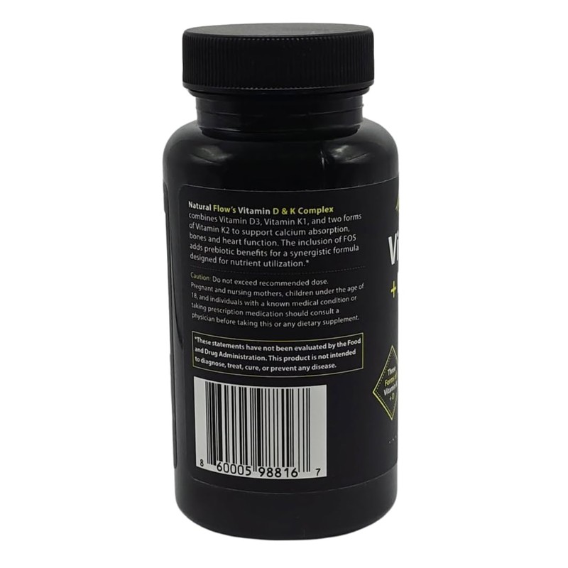 Introducing the Natural Flow Vitamin D3 and K2 Complex, a premium supplement meticulously crafted to support your overall health and well-being. This powerful combination of d3k2 vitamins is designed to optimize your body's calcium absorption and promote bone, heart, and immune support. Our k2d3 vitamin supplement provides a synergistic blend of Vitamin D3 and Vitamin K2, ensuring maximum bioavailability and efficacy. Vitamin D3, often termed the 'sunshine vitamin,' plays a crucial role in maintaining optimal health. It aids in the absorption of calcium and phosphorus, essential minerals for bone strength and density. By incorporating Vitamin D3 with K2, our formula ensures that calcium is directed to bones and not vascular tissues, supporting the cardiovascular system. Natural Flow's Vitamin D3 and K2 Complex is available in convenient capsule form, making it easy to incorporate into your daily routine. Our vitamin d3 with k2 formula is perfect for those seeking to boost their immune system while supporting bone and cardiovascular health. This product is third-party tested to ensure purity, potency, and quality, making it one of the most trusted vitamin d3 k2 supplements available. Suitable for both men and women, our vitamina d3 con k2 is ideal for those looking to enhance their wellness naturally. Whether you're looking for a d3 k2 vitamin supplement to improve bone density, support heart health, or boost your immune system, Natural Flow's Vitamin D3 and K2 Complex is your trusted companion. Embrace the benefits of d3 and k2 supplements with the confidence of knowing you're choosing a product designed with your health in mind. Our vitamin d3 k2 5000 iu softgels are crafted with the utmost care, ensuring they meet the highest standards of quality and efficacy. Elevate your wellness journey with Natural Flow's Vitamin D3 and K2 Complex.