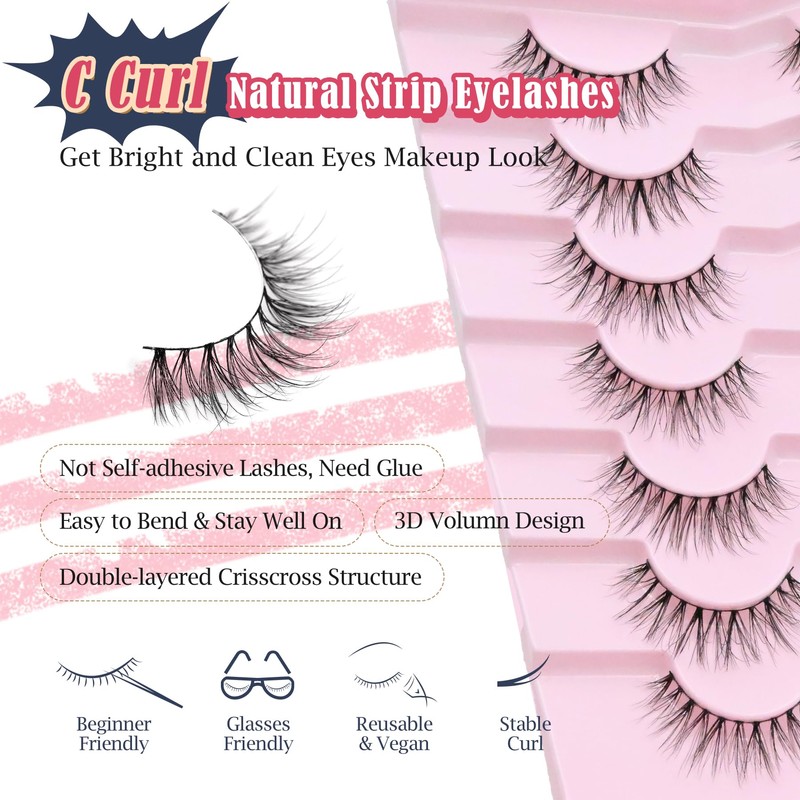 - VEGAN & REUSABLE FALSE LASHES: 7 pairs lashes pack. The fake lashes use ultra-light soft faux mink synthetic fibers, cruelty-free, skin friendly and all day curl lasting. Easy to apply eyelash. Perfectly suit for DAY-TO-DAY use, vacation party or date and all of age