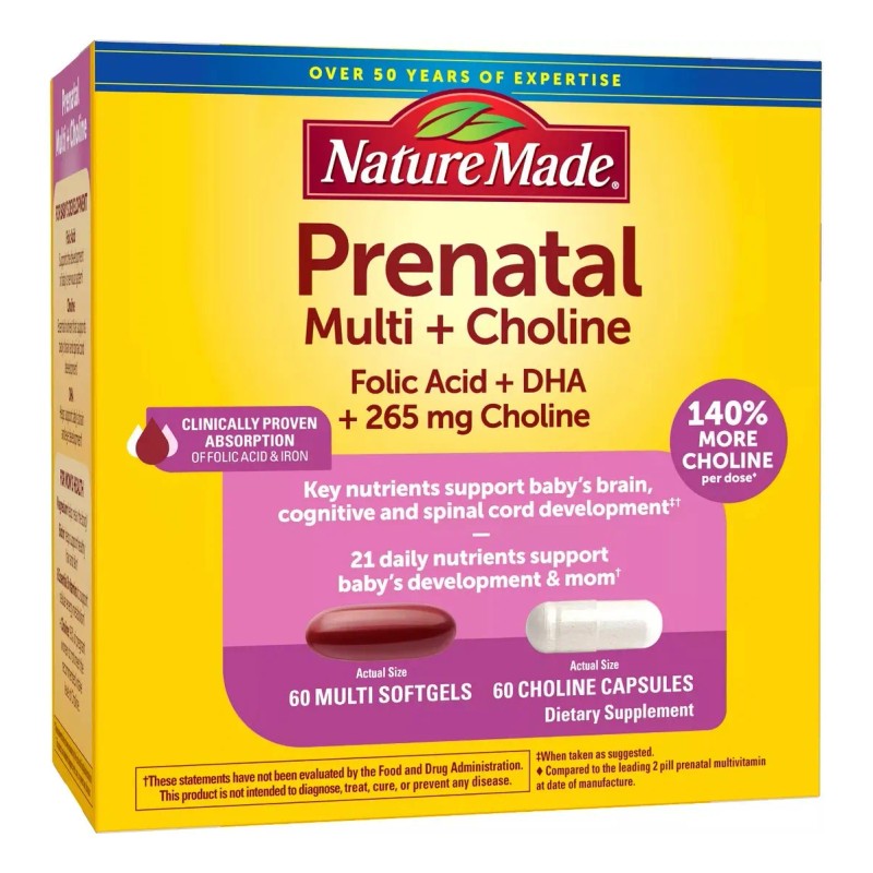 Natural Made Prenatal Multi + Colina, Ácido Fólico y DHA: Soporte Esencial para el Embarazo (120 Cápsulas sin Sabor)