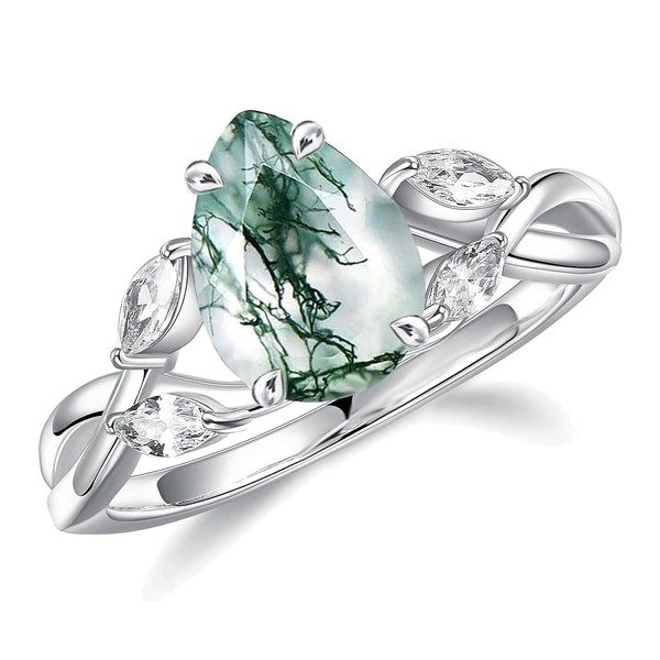 Natural Moss Agate Ring And Pear Shaped Birthstone Ring 925 Sterling Silver Leaf Birthday Engagement Wedding Promise Ring Jewelry for Women, 7, Gemstone, natural moss agate