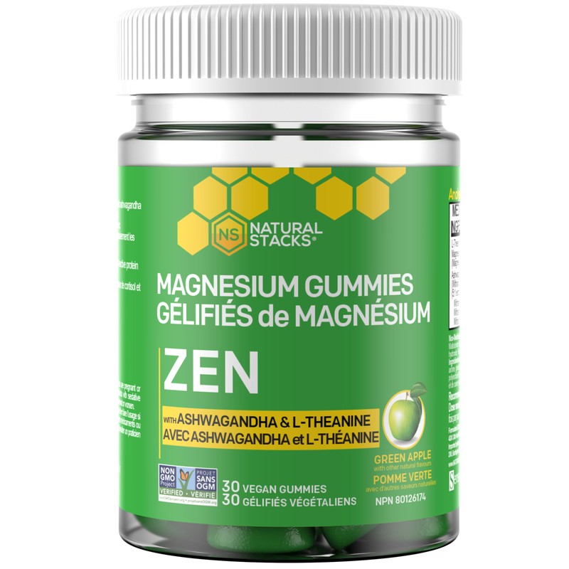 - Natural Stacks Magnesium Gummies Zen are Green Apple flavored gummies featuring three ingredients: Magnesium, L-Theanine & Ashwagandha. Mineral supplement.
