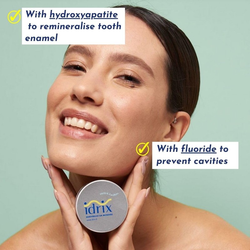 - 😊 With hydroxyapatite to naturally remineralise tooth enamel (hydroxyapatite is the main mineral component of teeth. The more the teeth are in contact with this mineral, the more effective the remineralisation is. Constant use is therefore recommended) and fluoride, the ingredient most recommended by dentists to prevent cavities (it contains 1200 ppm sodium fluoride). Fighting enamel erosion, it keeps teeth healthy and strong.