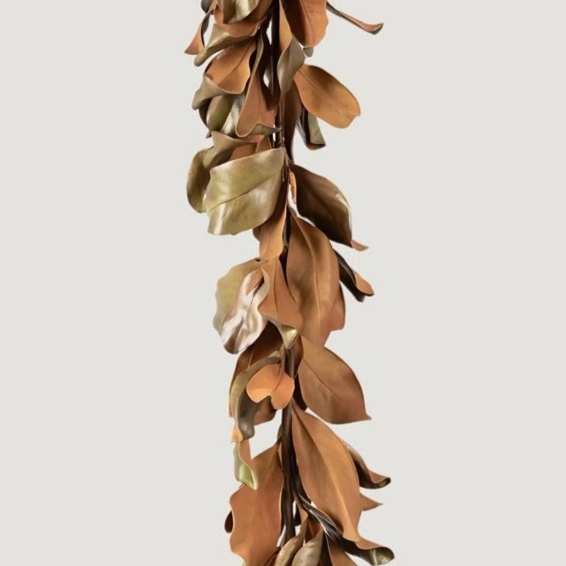 Experience the rich beauty of autumn in the warmth of your home with this natural touch artificial magnolia leaf garland. The lifelike faux leaves in rich brown hues make this real touch magnolia foliage garland a stunning fall decoration to incorporate into seasonal mantle styling and tablescape designing. Style it on your dining table and instantly set the scene for your Thanksgiving dinner party!
