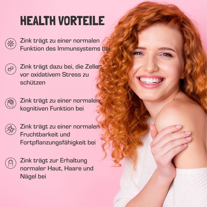- For health: a zinc supplement with zinc 10 mg is important for the immune system, fertility as well as for stable nails, skin and hair.