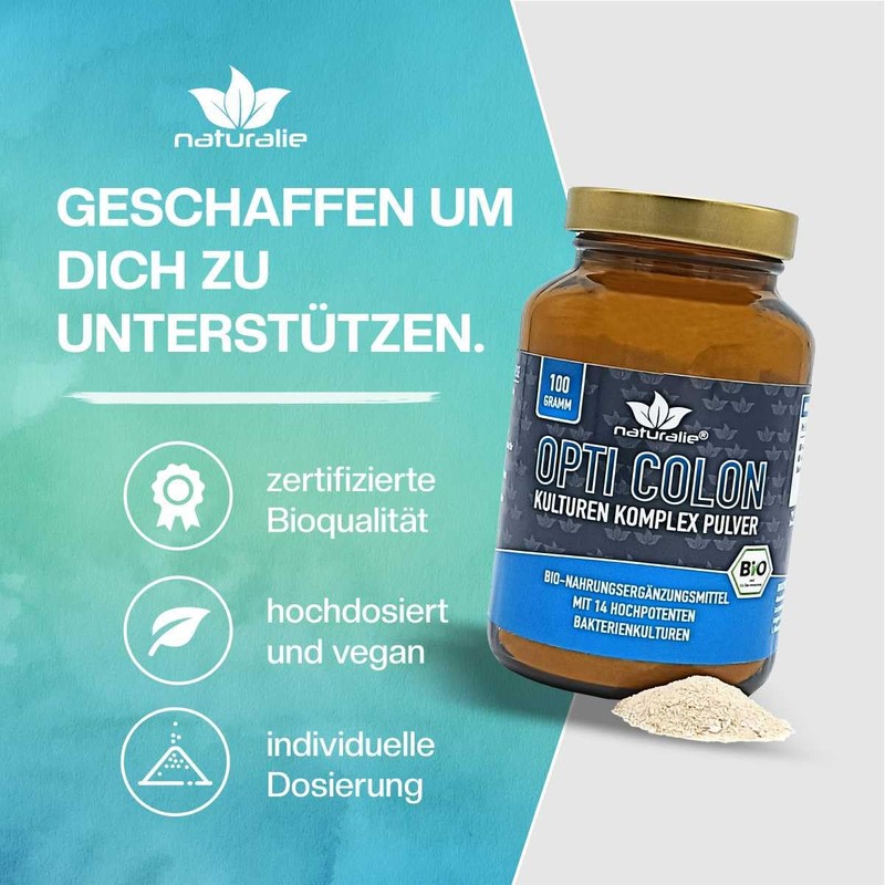 - ✅ 100 - Our complex of lactic acid bacteria also contains organic inulin and organic acacia fibre powder, which serve as food for the bacteria and thus perfectly complement OPTI COLON. 100 grams of powder is enough for about 50 days, packed in a high quality brown glass jar, BPA free.