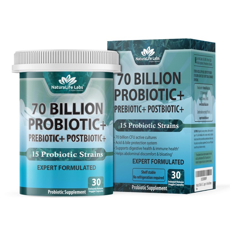 - 3-IN-1 70 Billion Probiotic+, Prebiotic+, Postbiotic+. Carefully formulated by experts