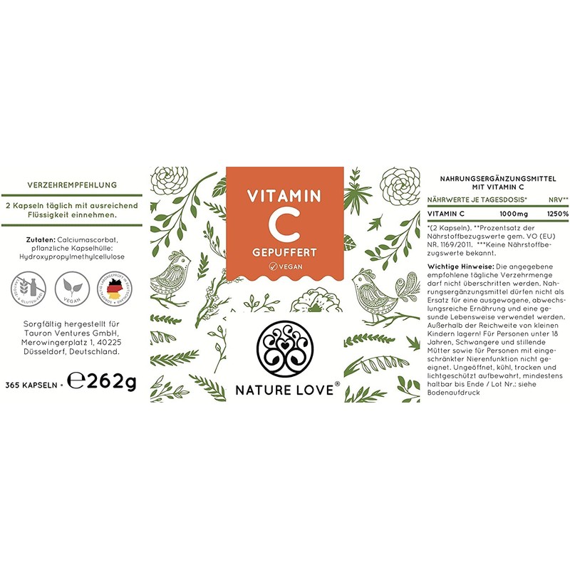 NATURE LOVE® Gepuffertes pflanzliches Vitamin C - Hochdosiert mit 1000mg Vitamin C je Tagesdosis - 365 Kapseln - pH-neutral & magenfreundlich - Vegan