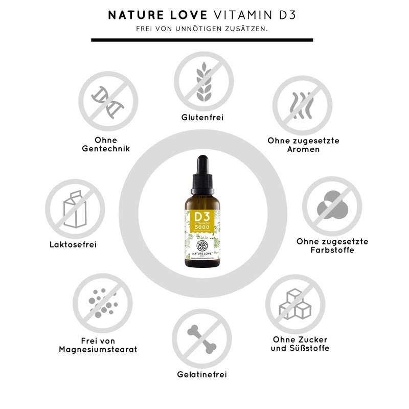 NATURE LOVE® Vitamin D3 5000 (50 ml Liquid) - Laboratory Tested 5000 IU. (125 μg) Per Drop - in MCT Oil from Coconut - High Quality: Very High Stability - High Dosage, Produced in Germany