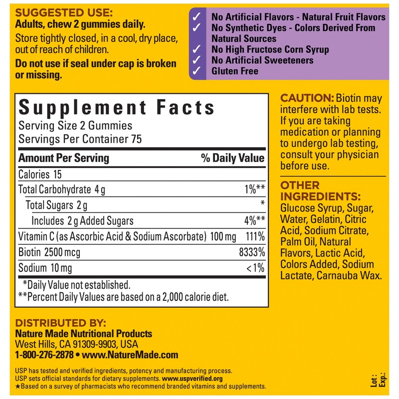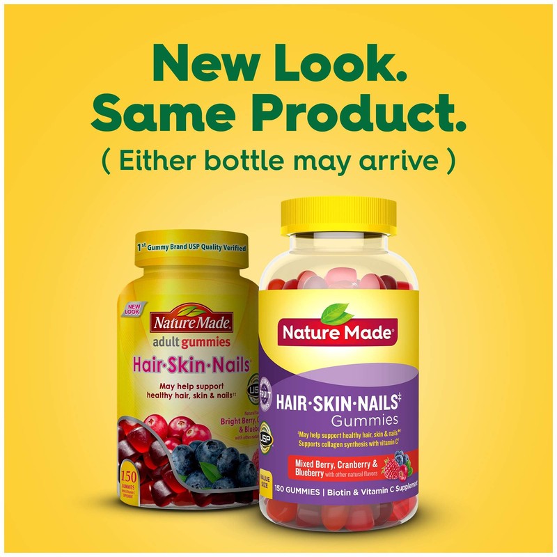 Nature Made Hair Skin and Nails with Biotin mcg Gummies offer a great-tasting dietary supplement that supports healthy hair, healthy skin, and nail health. Made from carefully selected ingredients under strict manufacturing processes, this Nature Made Biotin supplement is gluten free and has no synthetic dyes, no high fructose corn syrup, no artificial sweeteners, and no artificial flavors. These Nature Made Biotin gummies also support energy metabolism(). Available in delicious mixed berry, cranberry, blueberry, and other natural flavors, these Biotin gummies are a great option for people who want to supplement their Biotin intake. Adults, chew two of these Biotin gummy vitamins for hair skin and nails support daily. Nature Made supplements are quality you can trust. USP has tested and verified ingredients, potency, and manufacturing process. USP sets official standards for dietary supplements. Visit the USP verified website for more information. ()Helps convert food into cellular energy. Based on a survey of pharmacists who recommend branded vitamins and supplements. These statements have not been evaluated by the Food and Drug Administration. This product is not intended to diagnose, treat, cure or prevent any disease.