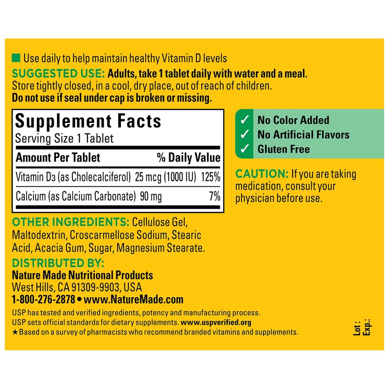 Nature Made Vitamin D3 1000 IU Tablets (25 mcg) offer an easy way to add Vitamin D supplements to your daily routine to support bone, teeth and muscle health. Sourced from high quality ingredients, these Nature Made Vitamin D tablets are dietary supplements with no color added and no artificial flavors. Each Vitamin D3 1000IU tablet supports a healthy immune response and aids in calcium absorption. Vitamin D is a common nutrient shortfall. D3 vitamin is the body's preferred form of Vitamin D to help maintain Vit D levels. These Nature Made Vitamin D3 supplements contain 25mcg (1000 IU) of Vit D3 per serving. Adults, take one Vitamin D3 Nature Made tablet daily with water and a meal. This Nature Made Vitamin D supplement is quality you can trust. *Based on a survey of pharmacists who recommend branded vitamins and supplements.