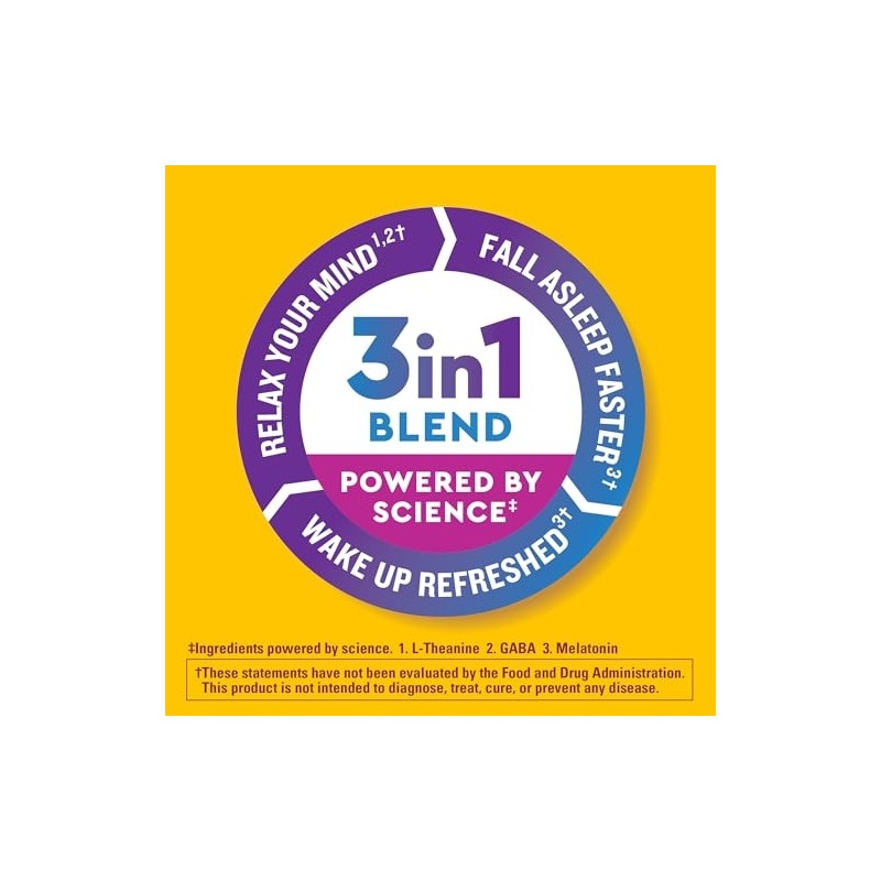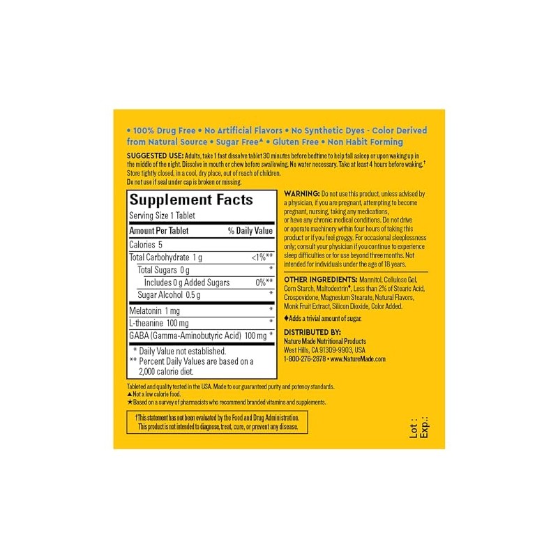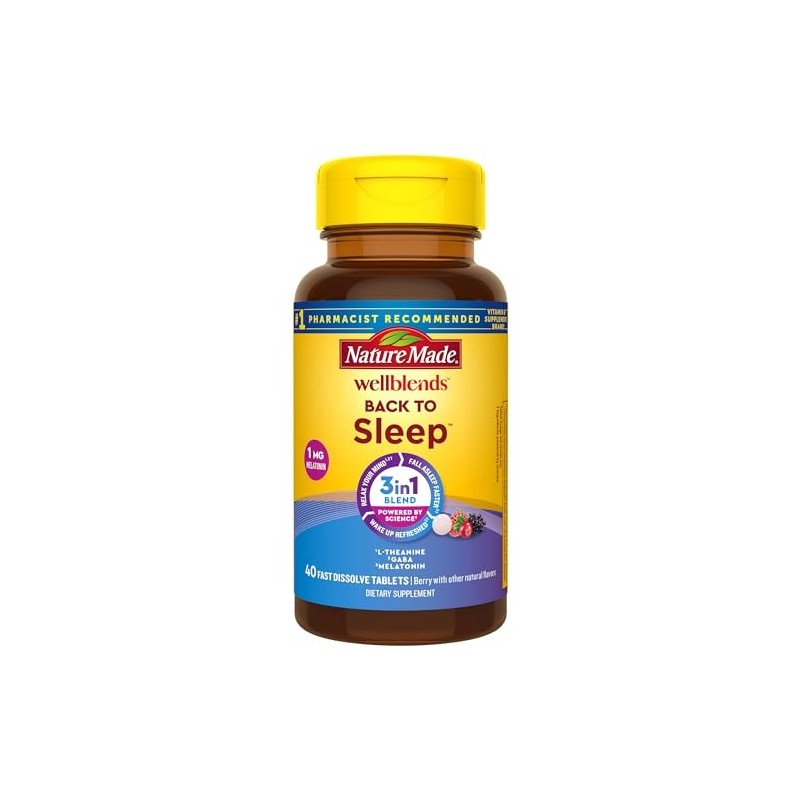 Nature Made Wellblends Back To Sleep provides 3 benefits in 1 blend for sleep support. This 100% drug-free occasional use sleep aid combines lower dose Melatonin 1mg (2) with a blend of GABA 100 mg and L-theanine 100 mg. Support for a calm and relaxed mental state can be found in GABA supplements like these that also contain L-theanine to help you unwind by relaxing your mind before bedtime. Melatonin helps you fall asleep faster and wake up refreshed. All this support in just one easy, sugar free Melatonin (3) fast dissolve tablet you can take without water. Adults, take 1 fast dissolve tablet 30 minutes before bedtime to help fall asleep or upon waking in the middle of the night. Dissolve in mouth or chew before swallowing. Take at least 4 hours before waking. Comes in delicious Berry flavor with other natural flavors. For other sleep supplements, try our Nature Made sleep aids for adults extra strength and more. (1)Ingredients powered by science (2)Compared to Nature Made Wellblends Melatonin products (3)Not a low calorie food (4)Melatonin helps you fall asleep faster and wake up refreshed *Based on a 2022 survey of pharmacists who recommend branded vitamins and supplements.