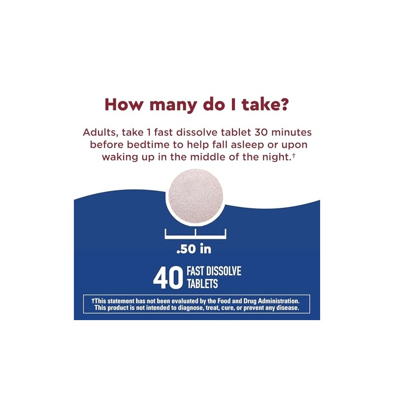 • HIGH QUALITY INGREDIENTS: This sugar free (3) occasional use sleep aid is 100% drug-free and non-habit forming; Adults, take 1 fast dissolve tablet 30 minutes before bedtime or upon waking in the middle of the night, no water needed